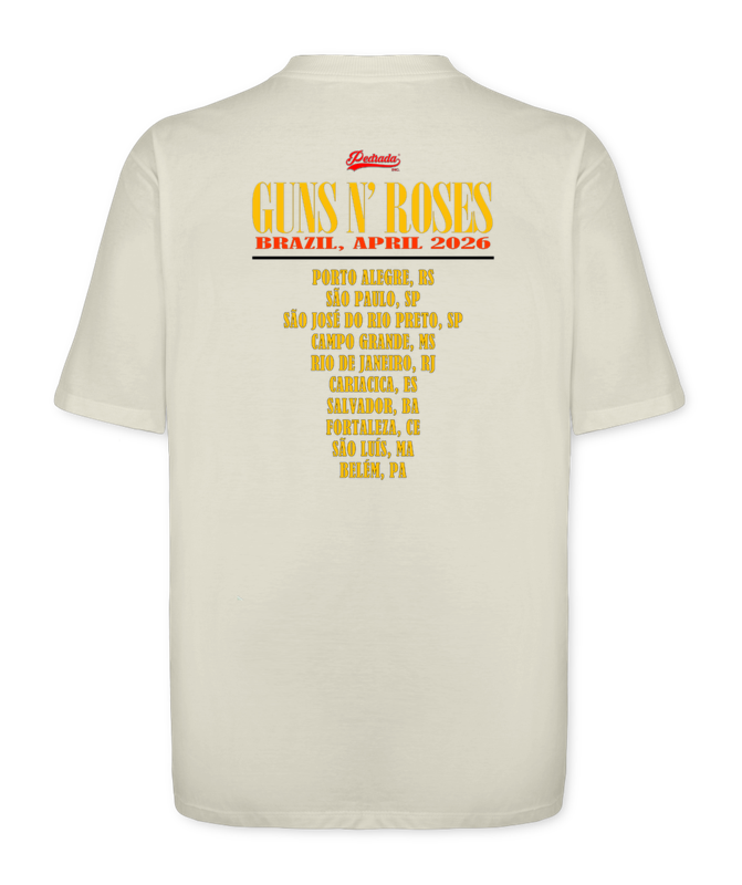 Esta camisa traz a imagem icônica que o Guns N' Roses escolheu para desafiar o sistema após o banimento da capa original do álbum “Appetite for Destruction”, de 1987 e de quebra traz nas costas a cidades brasileiras, por onde a banda vai passar na turnê 2026. Vista a arte que transformou o caos em um dos maiores legados do Hard Rock.